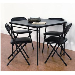 Provide excess seating for your family members and buddies with the Cosco Card Table and Chair Set. This 5 piece table and chair set is fantastic for get-togethers or situations the place a eating table set is required. It's huge more than enough for four people to engage in card video games, make crafts, or share a meal. The modern black exterior will enhance virtually any home decor, and the chairs tuck neatly below the card table aid optimize house. So, you can also use this home furnishings set in your eating house as well as patio. The chairs function vinyl upholstered seats, and the table prime is made out of PVC, creating this table set extremely snug and simple to cleanse. Plus, you would not want to fear about the muddle as this black table and chair set folds up neatly for room-conserving storage. It can be perfect for workplaces, rec rooms, smaller apartments, and extra.