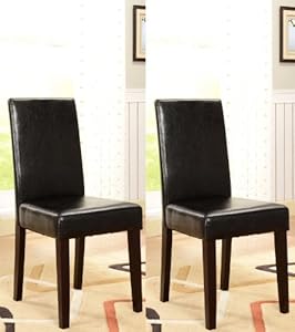 - Featuring espresso finish solid wood legs and a black faux-leather upholstery, this set of two chairs will add seating and depth to your dining room décor.