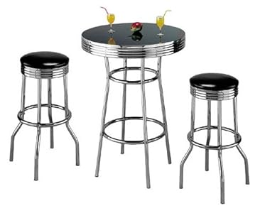 I lately procured this set for a pal. I presently owned a set and when i bought it the cost was about 3-periods as significantly. While a little distinct than mine the key change is the stools really don't swivel on this set, but it's a little reduction presented the remarkable selling price distinction. The chrome end, review stools and slick black oil table leading on this set is fantastic and unquestionably bar good quality. Stong durable and uncomplicated to assemble, you truly can not go improper for a large bar table and two stools for the remarkable price tag.