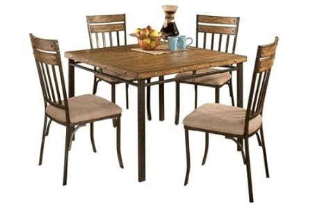 This stunning dining set adds a understated style to your dining room. Square wood table prime is created with thick elm veneers in a rustic brown complete. Metal base and open apron are concluded to match the table major . 4 metal slat again chairs with elm veneer major rails, give a great deal of room for your family members and guests. Decorative nail accent on table and chairs tie the set together superbly.