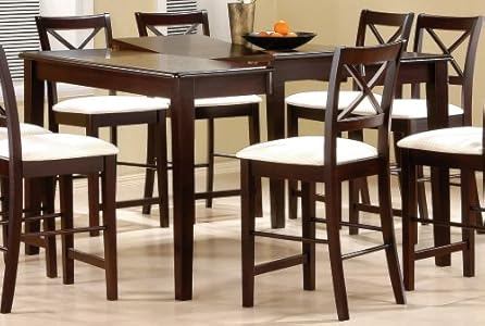 Stools not integrated. Modern fashion. Sleek table prime with rounded edge. Middle butterfly leaf. Modern sq. tapered legs. Deep cappuccino finish. 54 in. L x 54 in. W x 36 in. H. Warranty This wonderful contemporary counter height table will be a excellent addition to your everyday dining and amusement space.