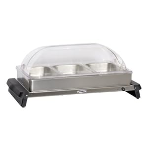 - Stainless warming tray base is equipped with an adjustable thermostat that ranges from 155 - 205 degrees F