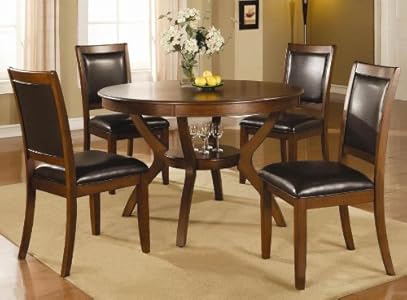 102171 Features: -Everyday design.-Smooth straight traces and flared backs.-Round edges.-Rectangular shape.-One pedestal. Incorporates: -Set contains dining table and 4 chairs. Design: -Hardwood and veneer development. Coloration/End: -Brown walnut complete. Assembly Guidance: -Assembly required. Selection: -Swanville collection. Table Dims: 48' X 48' X 30'.
