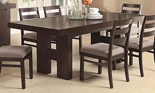 This transitional dining table produced of ash solids and hardwoods in cappuccino Finish provides easy-heading design to your casual or semi-formal dining place. The contemporary table characteristics clean strains with the significant H-variety double pedestal bases. The pull out extension leaf boosts the flexibility of this table so it adjusts to the dimensions you want, no matter the situation. Matching chairs offered separately. Assembly demanded. Dimensions: seventy one-86.5L x 39.25W x thirty.75H